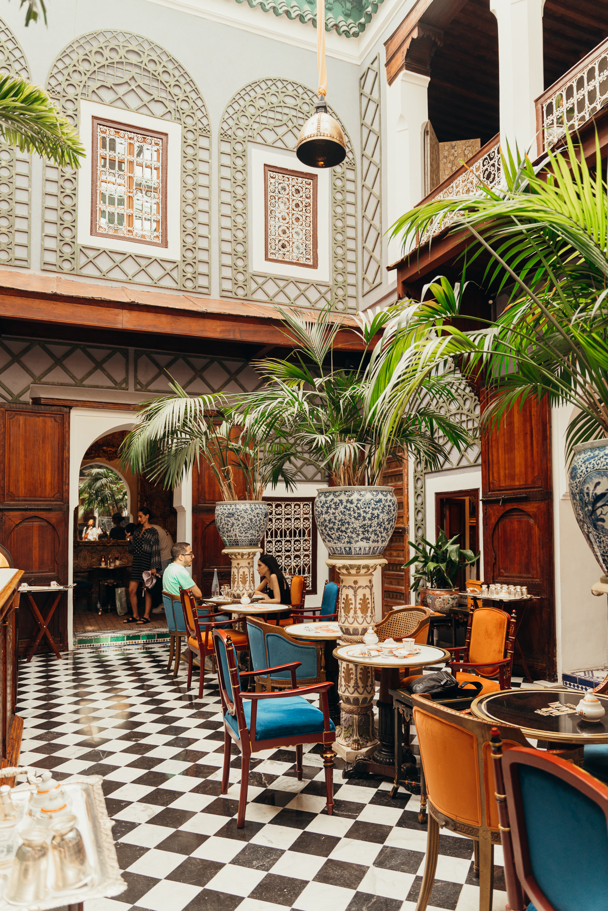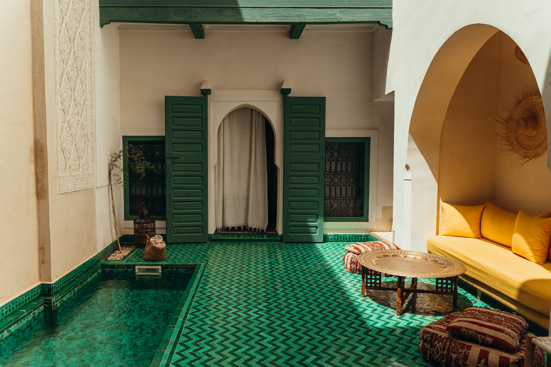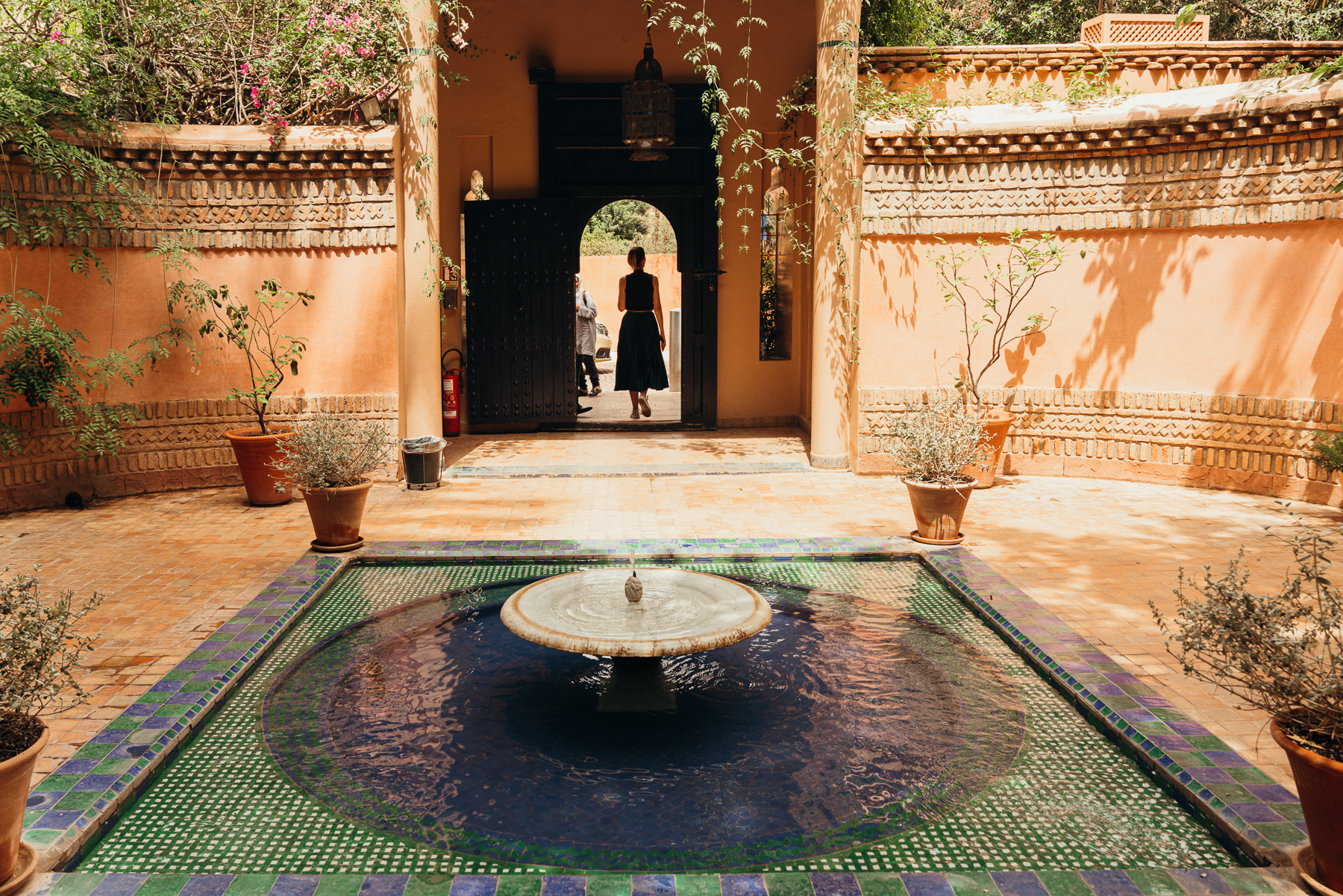 Lo más interesante es la llegada porque como la medina es peatonal, uno se baja del taxi en una calle bulliciosa y lo esperan con una carreta en la que montan el equipaje y caminando por callejones retorcidos y diminutos se llega a puertas escondidas que cuando se abren llevan a este paraíso de silencio y pajaritos en medio del caos del centro de la ciudad y el bazar.