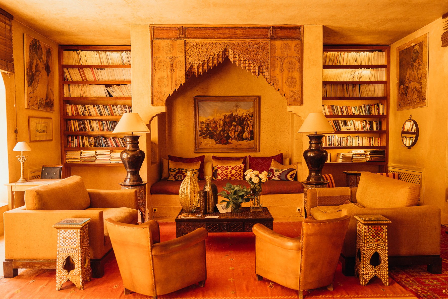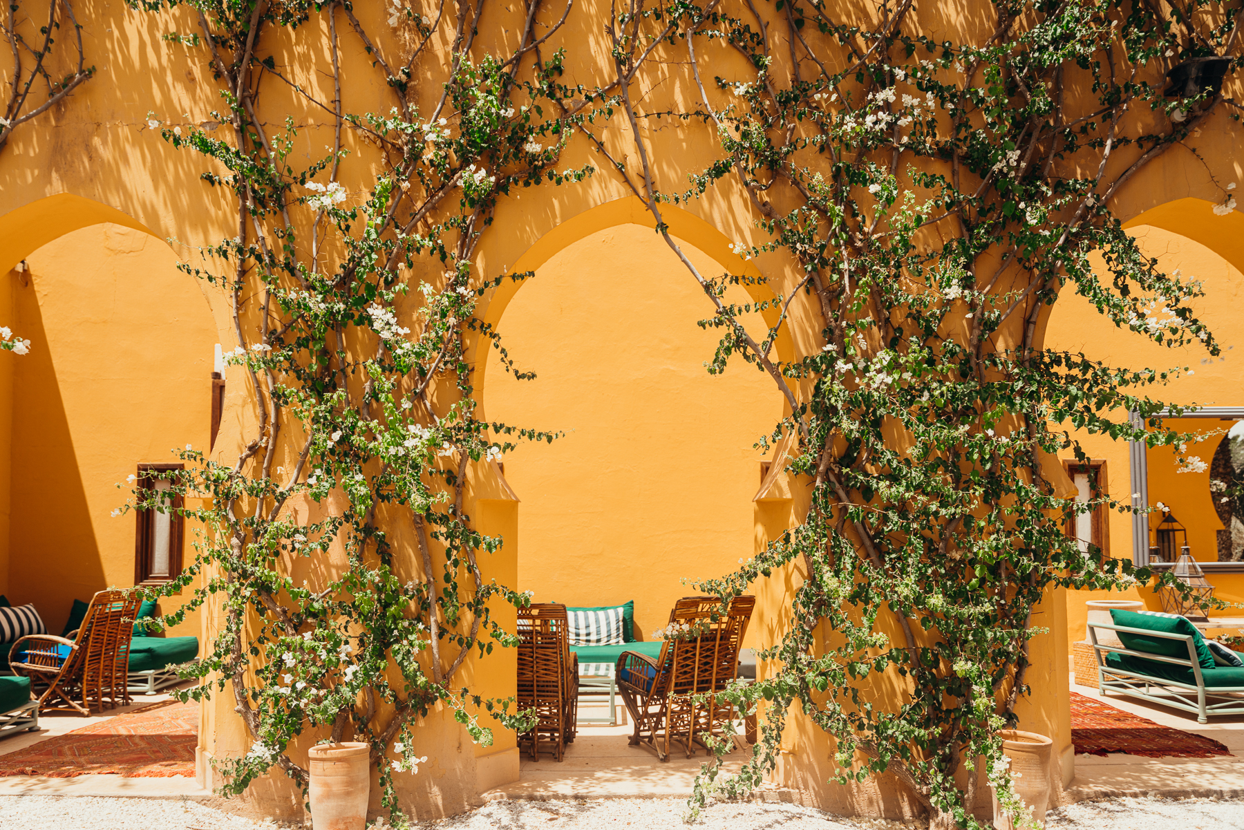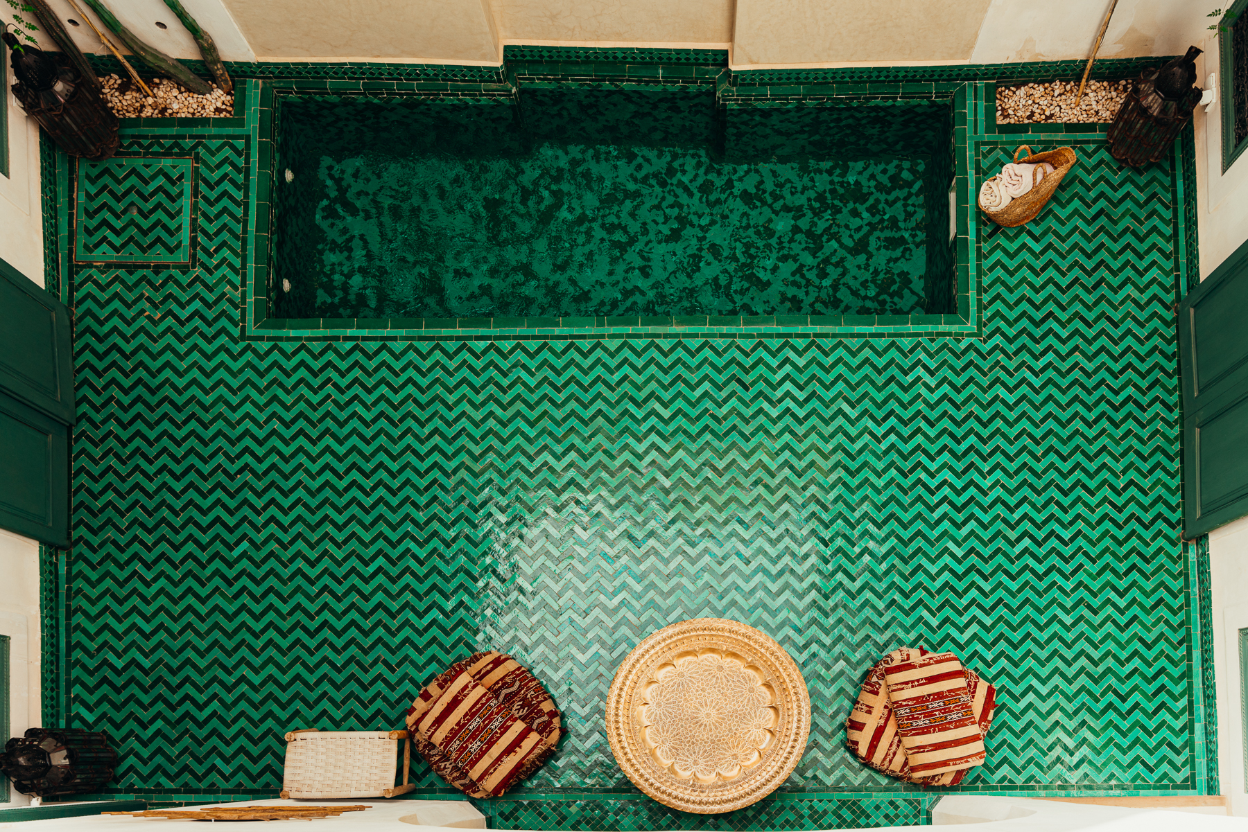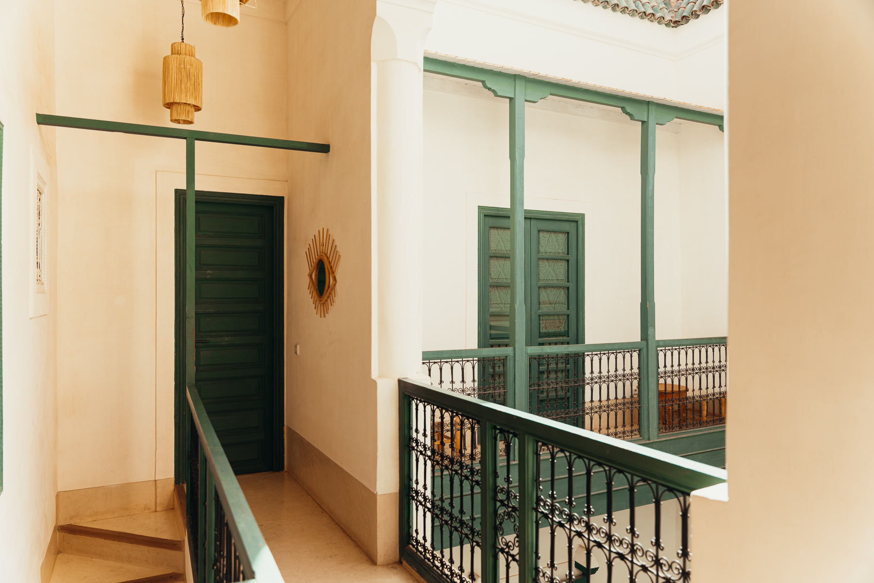 Lo más interesante es la llegada porque como la medina es peatonal, uno se baja del taxi en una calle bulliciosa y lo esperan con una carreta en la que montan el equipaje y caminando por callejones retorcidos y diminutos se llega a puertas escondidas que cuando se abren llevan a este paraíso de silencio y pajaritos en medio del caos del centro de la ciudad y el bazar.