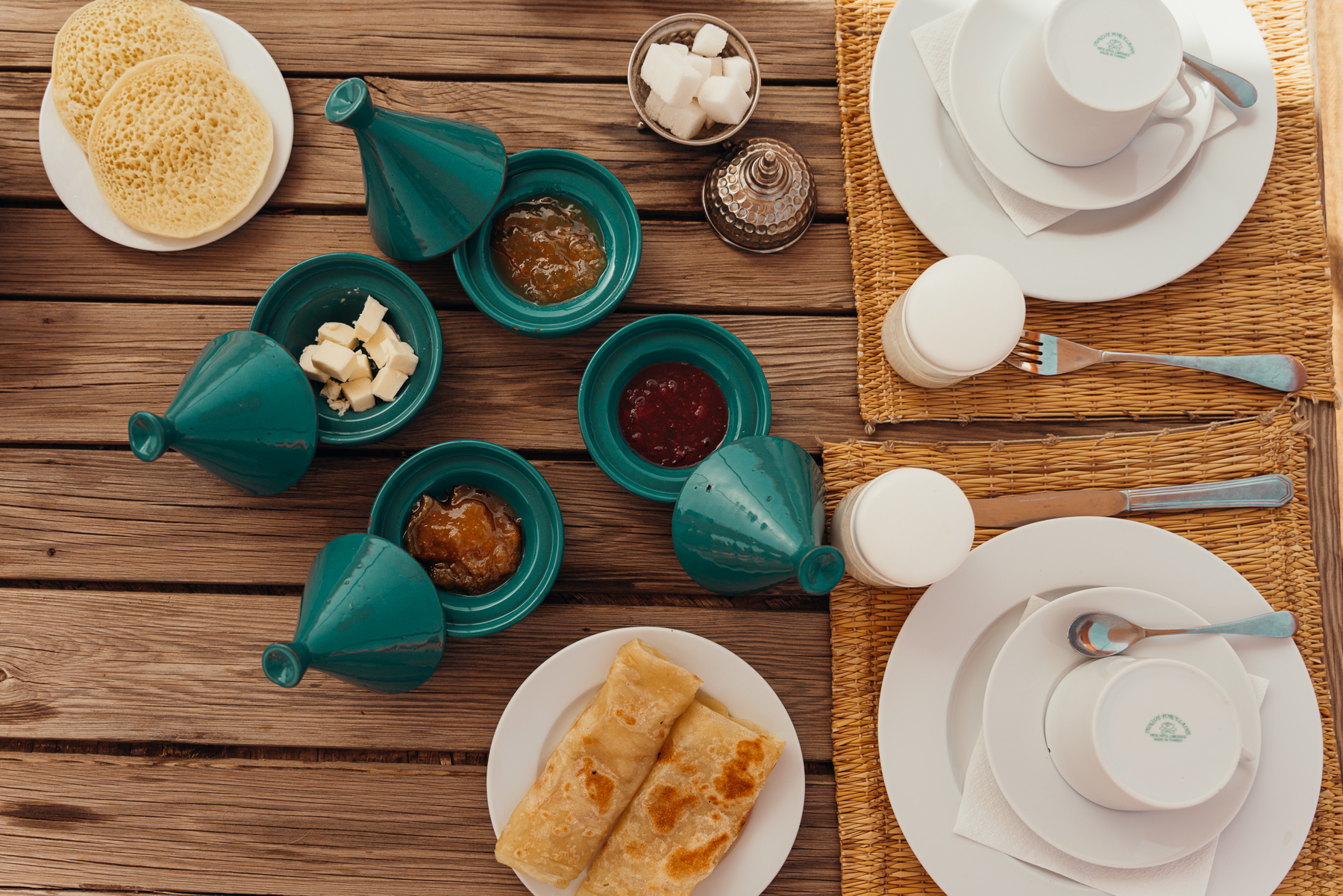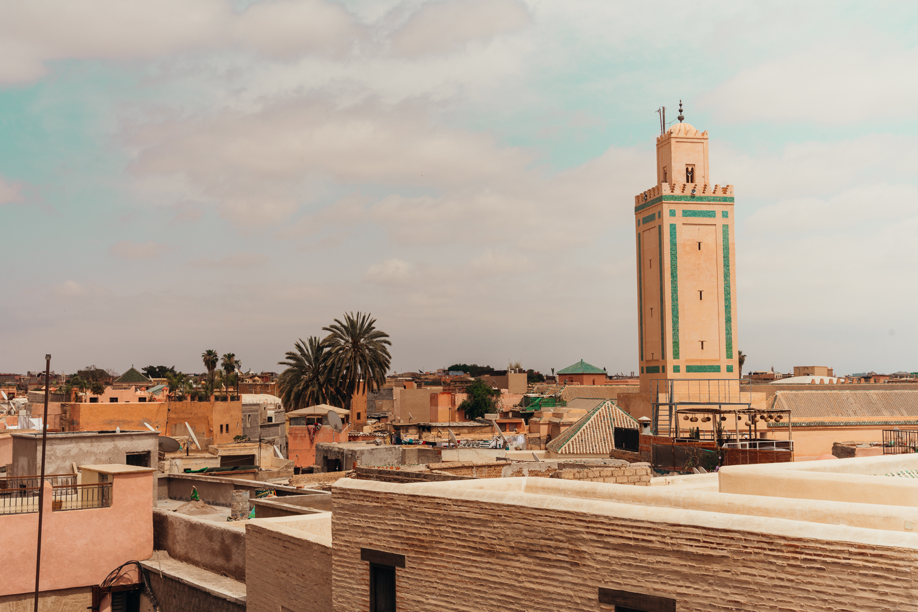 Nuestros hoteles eran varias riads de la medina de Marrakech unidas por dentro, por eso en las fotos van a ver varios colores y varios patios, y todas tenían una terraza en donde nos servían un desayuno tradicional delicioso de huevos, fruta, y los tradicionales pancakes marroquís que se llaman msemen.