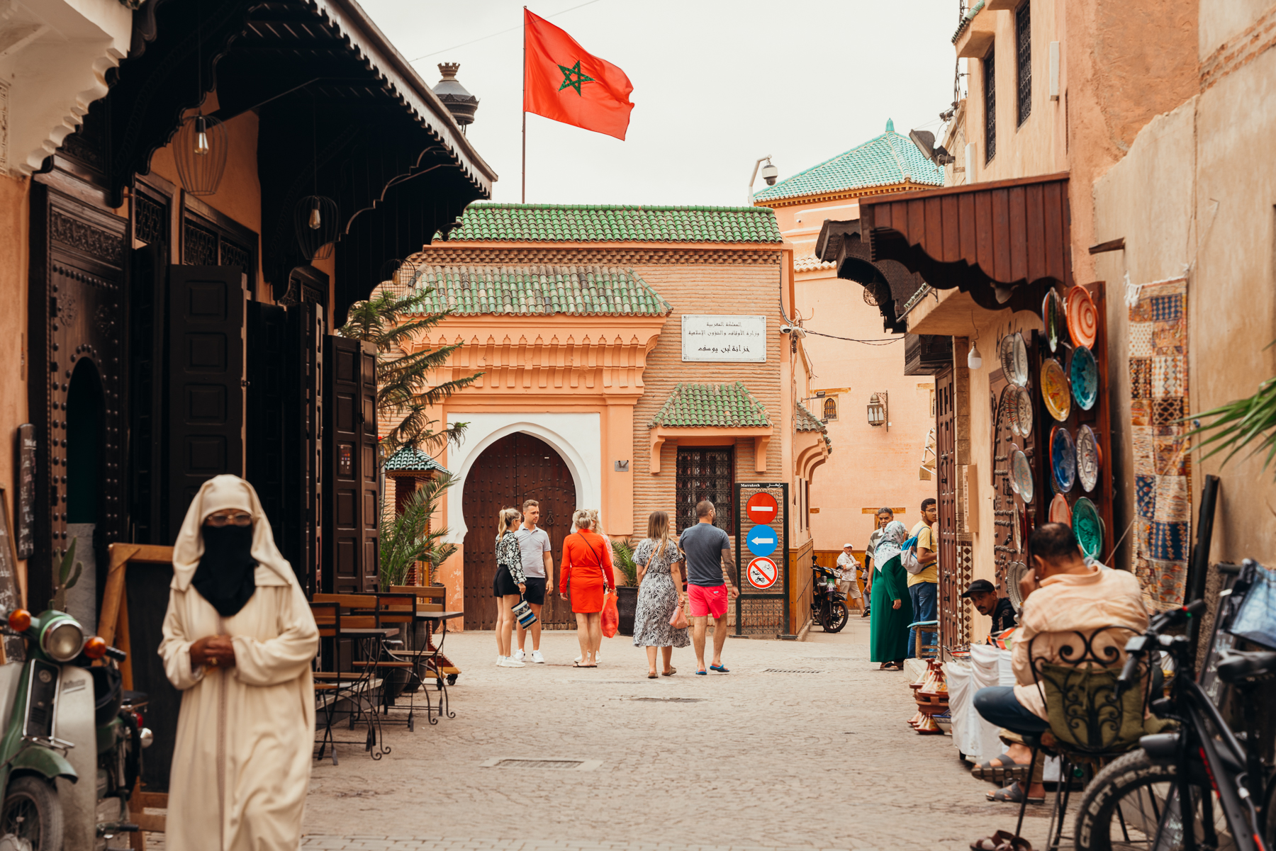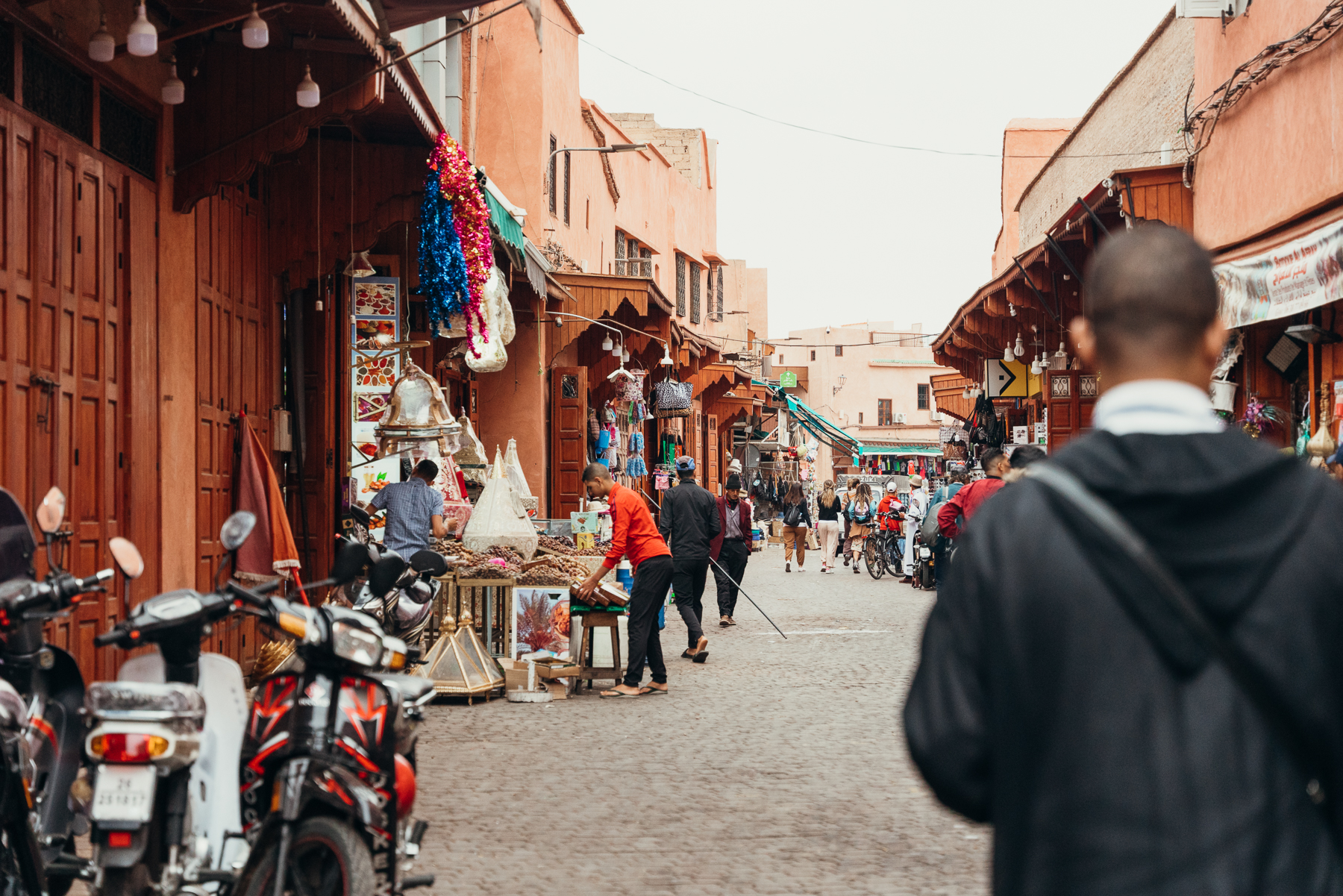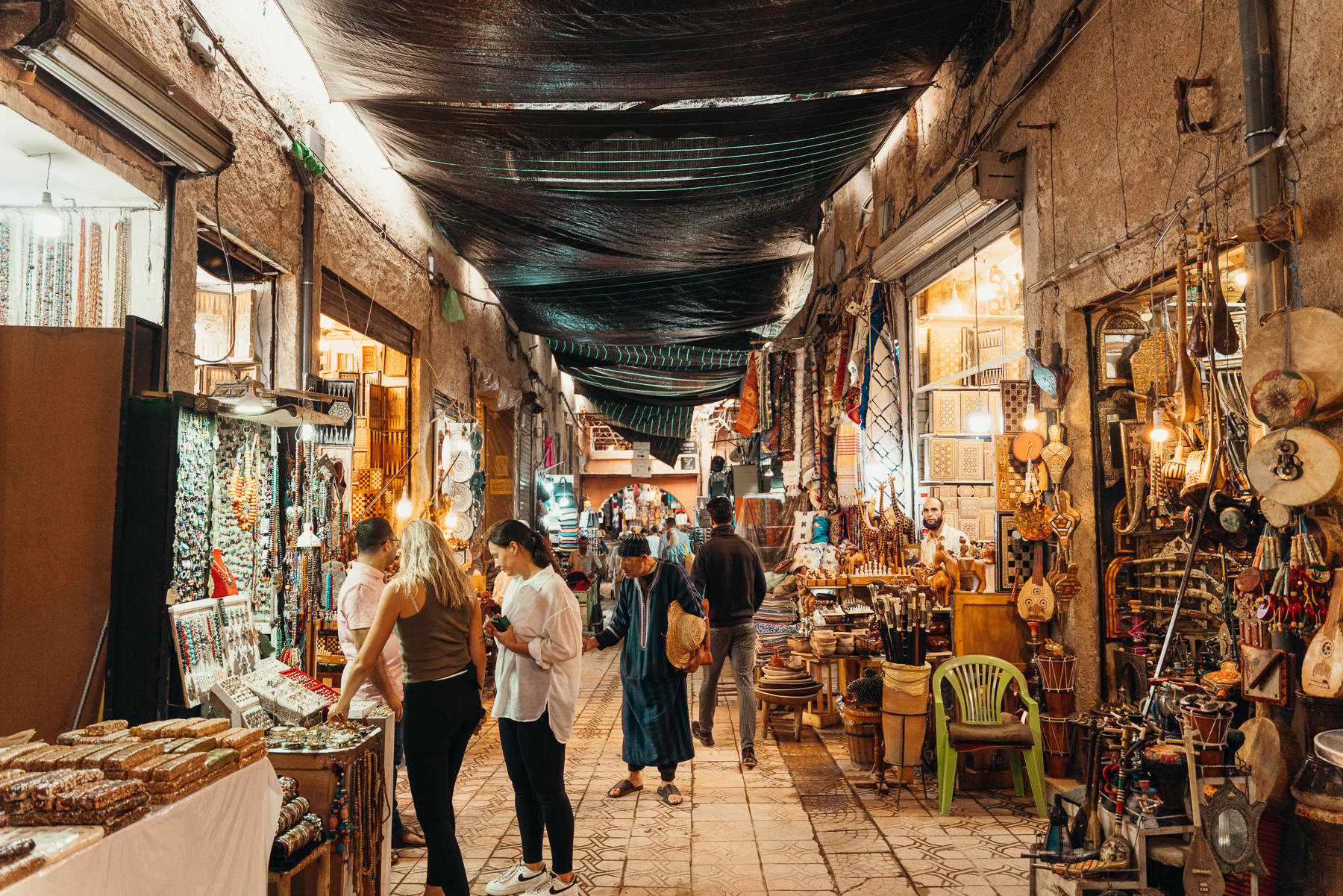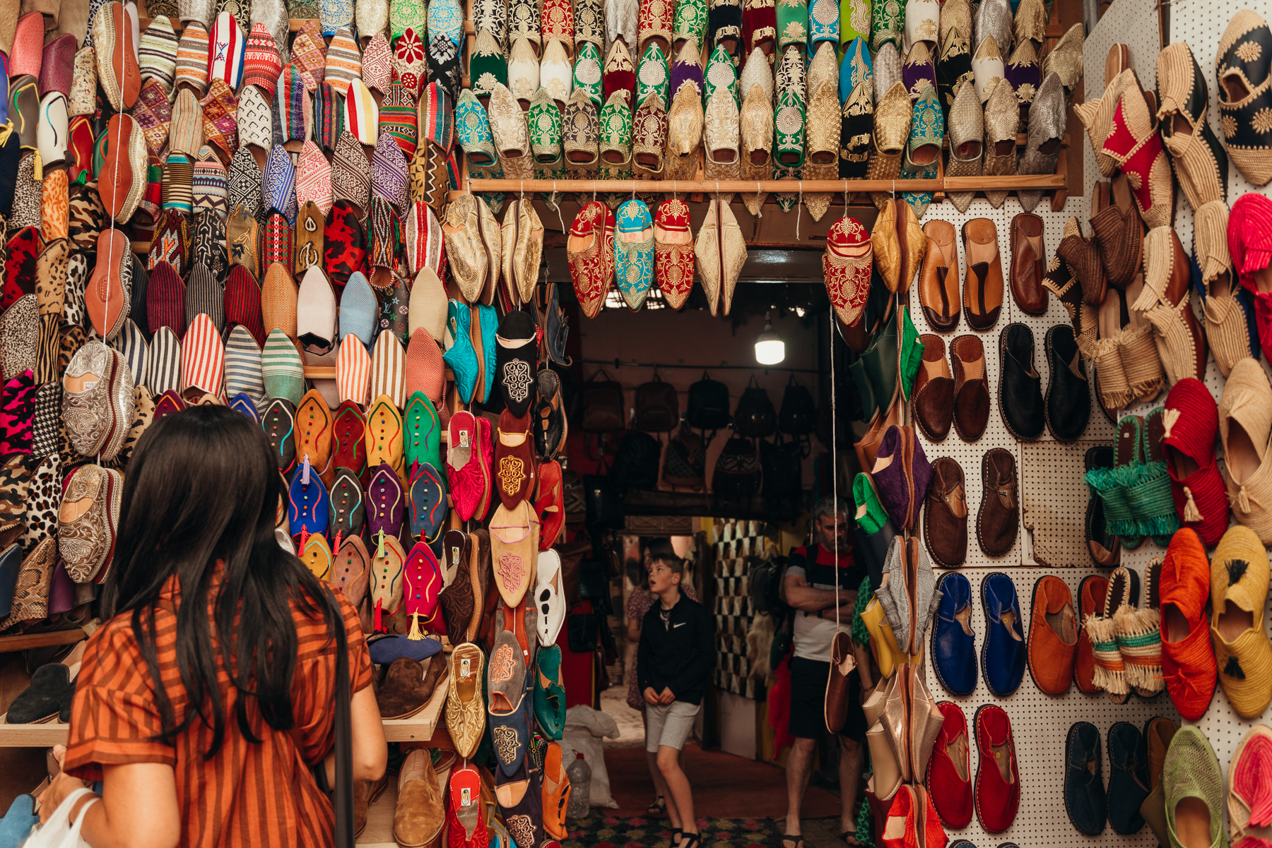 - Caminar por el bazar infinito de la medina de Marrakech es fascinante y a veces abrumador, por eso es importante tener zapatos cómodos para, pueden ser sandalias para estar más frescos o tennis. Y, muy importante no engancharse con todas las personas que te hablan o te sonríen, ni siquiera con los niños porque te van a perseguir y va a ser muy difícil quitárselos de encima sin darles plata. Si son mujeres, eviten sonreírle e interactuar con la gente que les dice cosas, simplemente sigan de frente o digan “no, gracias” (la, choukran).
