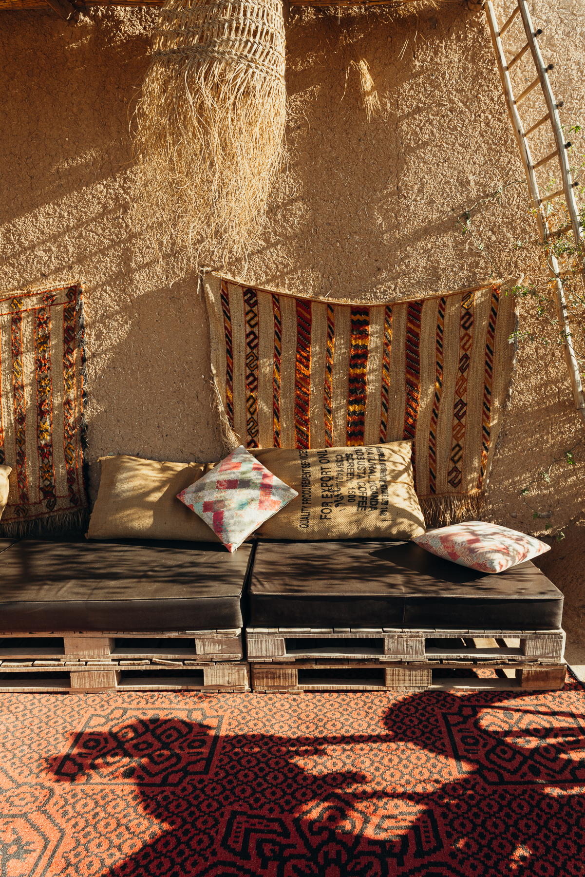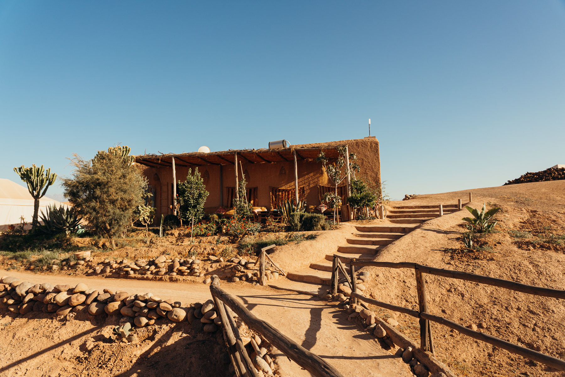 El hotel es precioso y estuvimos conversando con los dueños que son un etnobotánico y una diseñadora de interiores que nos contaron cómo fue la restauración de lugar y la creación de los jardines y sus retos en medio de un desierto. Además, conocimos a Smoky su perro Aidi, una raza tradicional de los montes Atlas que se caracteriza por tener patas muy flexibles y peludas para caminar sobre la arena.
