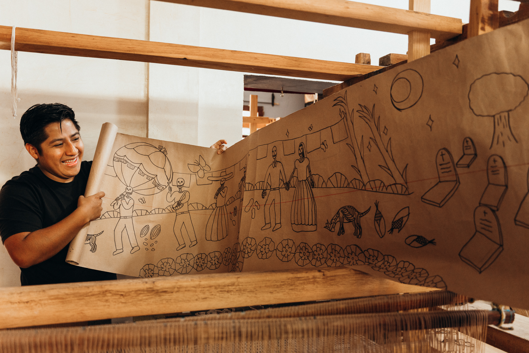 Es un pueblo principalmente, sino es totalmente, Zapoteco, y nos contaron que prácticamente el 90% de sus habitantes viven del tejido, ya sea haciendo sus propias creaciones para vender a los visitantes o en los mercados, o, haciendo trabajos por encargo para artistas, hoteles, diseñadores (como rrres que les mencionaba en la primera publicación sobre Oaxaca de Juárez).